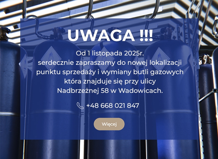 Serdecznie zapraszamy do nowej lokalizacji punktu sprzedaży i wymiany butli gazowych która znajduje się przy ulicy Nadbrzeżnej 58 w Wadowicach.